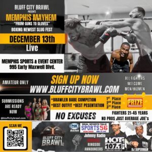 EVENTS DEC 13th 7:00pm Memphis Sports and Event Center Please enable JavaScript in your browser to complete this form.Please enable JavaScript in your browser to complete this form.Name *FirstLastEmail *Phone NumberComment or Message *This Box Is For General Questions (Someone will answer as soon as possible)RULES *I Accept The Rules* $500 to the winner of each Fight * Fights are 3, one minute rounds * 16 oz. gloves (provided by promoter). * No headgear. * No entry fee. Promoter pays for boxing license. * Must be between the ages of 18 – 39 yrs. old. * No Professional fighters allowed. * Weight Classes: Lightweight 100-130 lbs. Middleweight 131-160 lbs. Light Heavyweight 161-185 lbs. Heavyweight 186-215 lbs. Super Heavyweight 216 & aboveSocial Media Info FB/InstagramAre You A Professional Figter?YesNoHave you fought in any sanctioned boxing tournaments by an Athletic Commission? Ring NameAgeWeightHeightSexMaleFemaleOtherHave you had any sanctioned / organized fighting experience?YesNoGrudges?YesNoI Don’t KnowDo you have a grudge against someone that you would like to fight? Tell us about it.Are you tough enough to Brawl in this event? Do you have a grudge you want to settle? Let us hear about it! Whether its at the job, street grudge, church, etc., tell us!Street Brawl Record (example 1-0)How many street fights have you had? Go all the way back to kindergarten? List record.Consent required *I Agree to the consentI agree by submitting this form, I am giving BCB Promotions LLC. and its affiliates permission to use my photograph and or video imaging as part of their printed material, social media, website and any promotional marketing advertisement. I also agree that I own all rights to the photos & videos that I submit.Submit